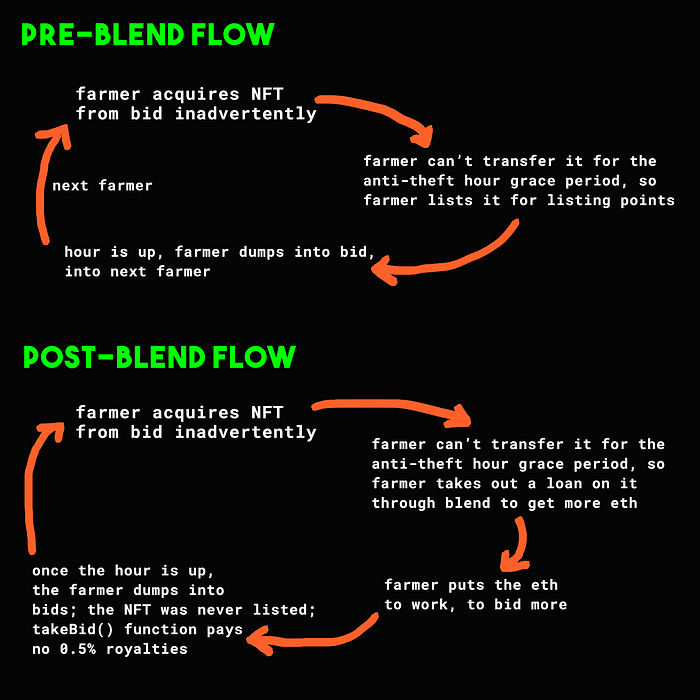 This means that farmers will continue to dump into each other at lower and lower bids without new supply hitting the market. Because there are no listing points on Blend collections, assets are always being recycled into lower bids.